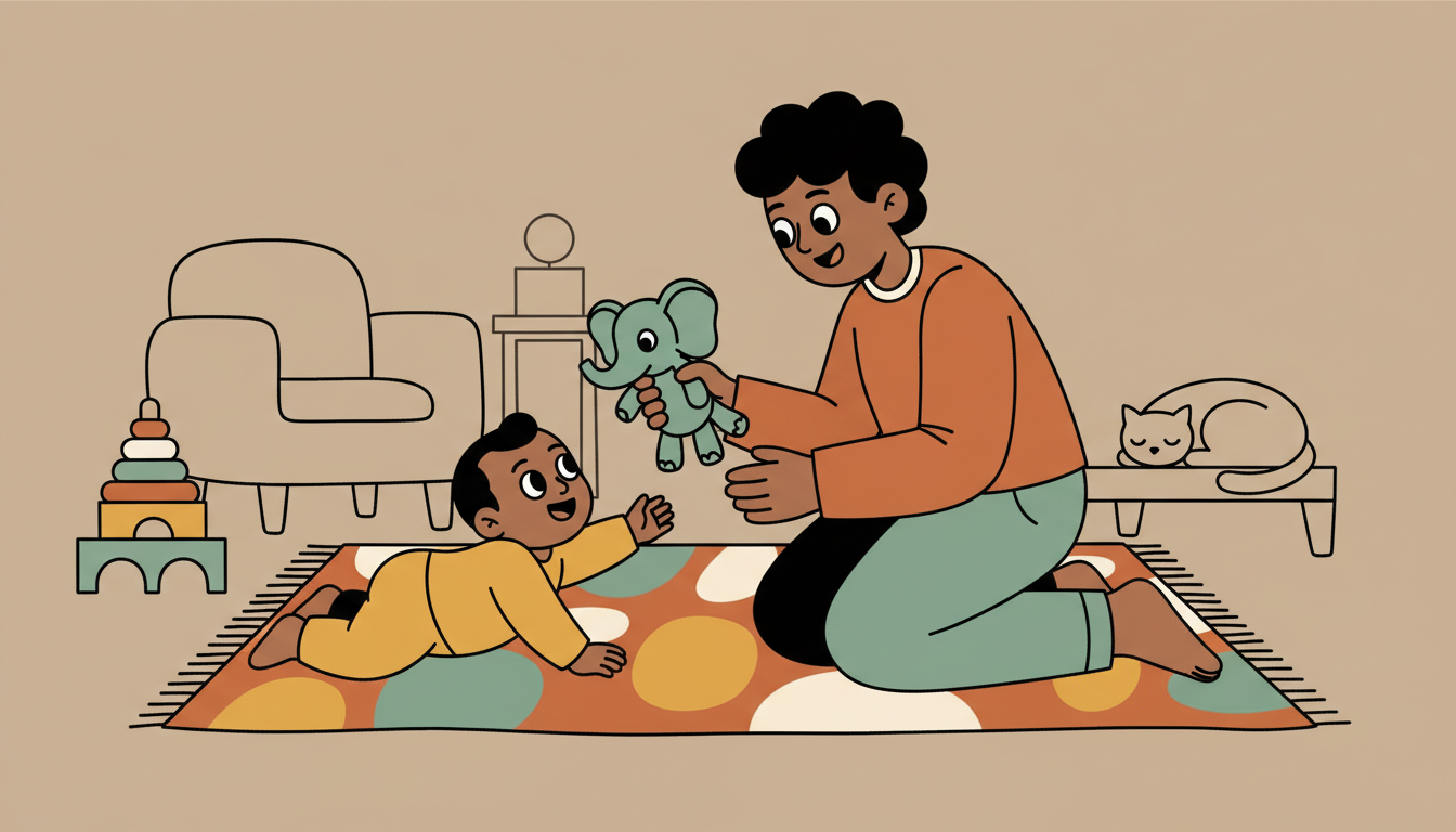 Place a favorite toy just beyond your child's easy reach while they're sitting or lying down. Watch them problem-solve how to get it, whether by stretching, rolling, or scooting. Encourage their efforts with your voice and expression. When they succeed, celebrate together. This supports their emerging sense that their actions have meaningful outcomes.