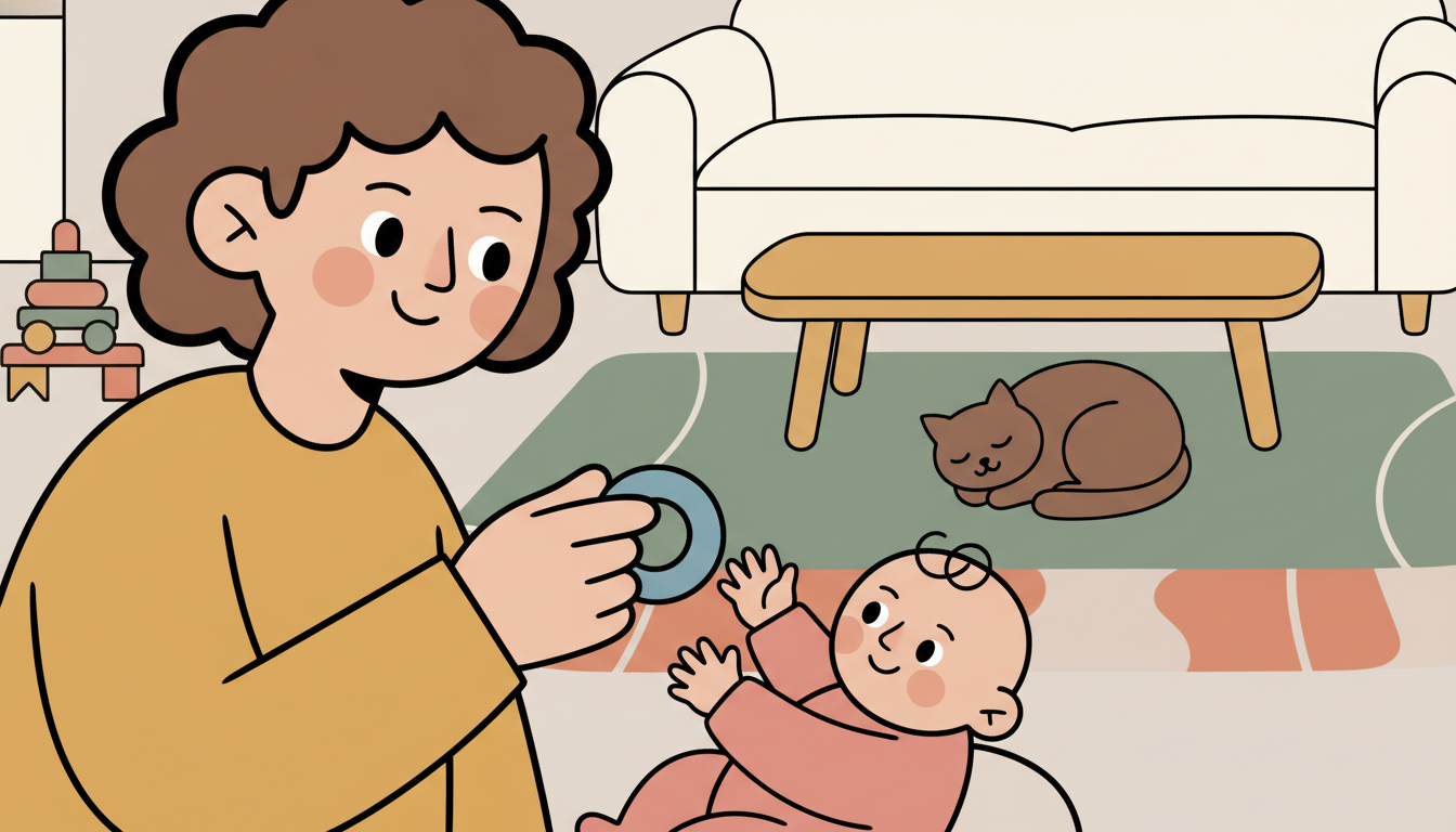 Choose objects that are easy to grasp and safe to mouth, like soft blocks or silicone rings. Do not force the transfer. If your child is not ready, simply let them explore with one hand and try again in a few weeks.