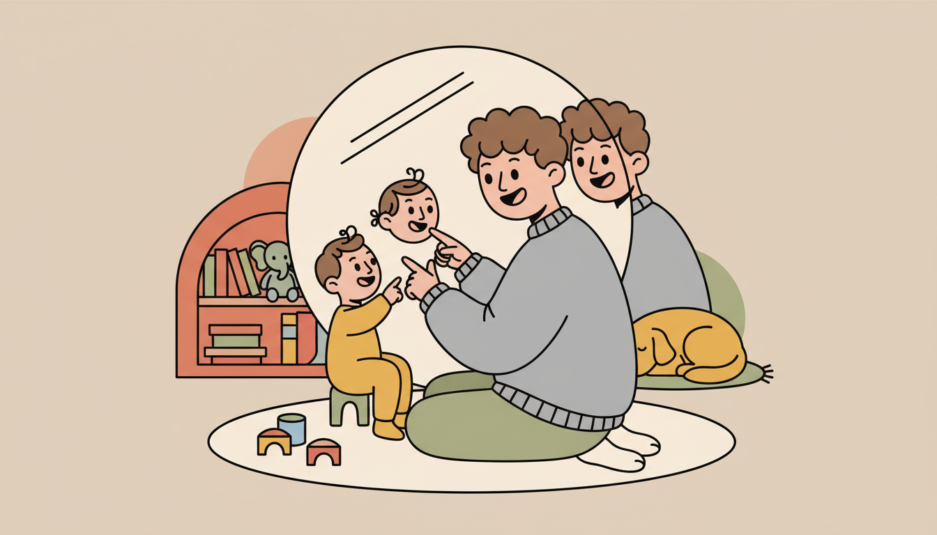 Sit with your child in front of a mirror and point to each other's reflections. Wave at the mirror, make faces, and point to different features. Say simple words like "you" and "me" while touching the reflections. This helps your child understand themselves in relation to others.