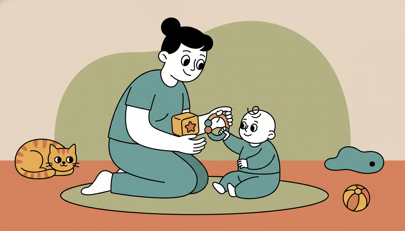 0–6 monthsEmotional WellbeingMaterials: Two different safe toys or household objects (soft toys, rattles, or textured cloths)