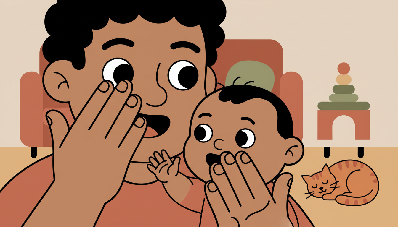 Play peek-a-boo using your hands or a soft cloth. Each time you reveal your face, smile warmly and use an upbeat tone to say "I see you" or "There you are." This teaches object permanence while creating joyful anticipation that good things happen even after brief absences.