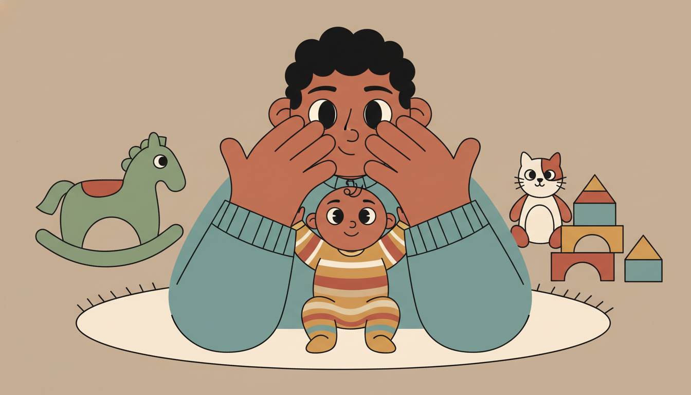 Play peek-a-boo while clearly announcing your actions. Say where did I go before covering your face, then pause before revealing yourself with here I am. Wait after each reveal to let your child respond with sounds, smiles, or gestures. This simple game teaches turn-taking and response patterns that form the basis of conversation.