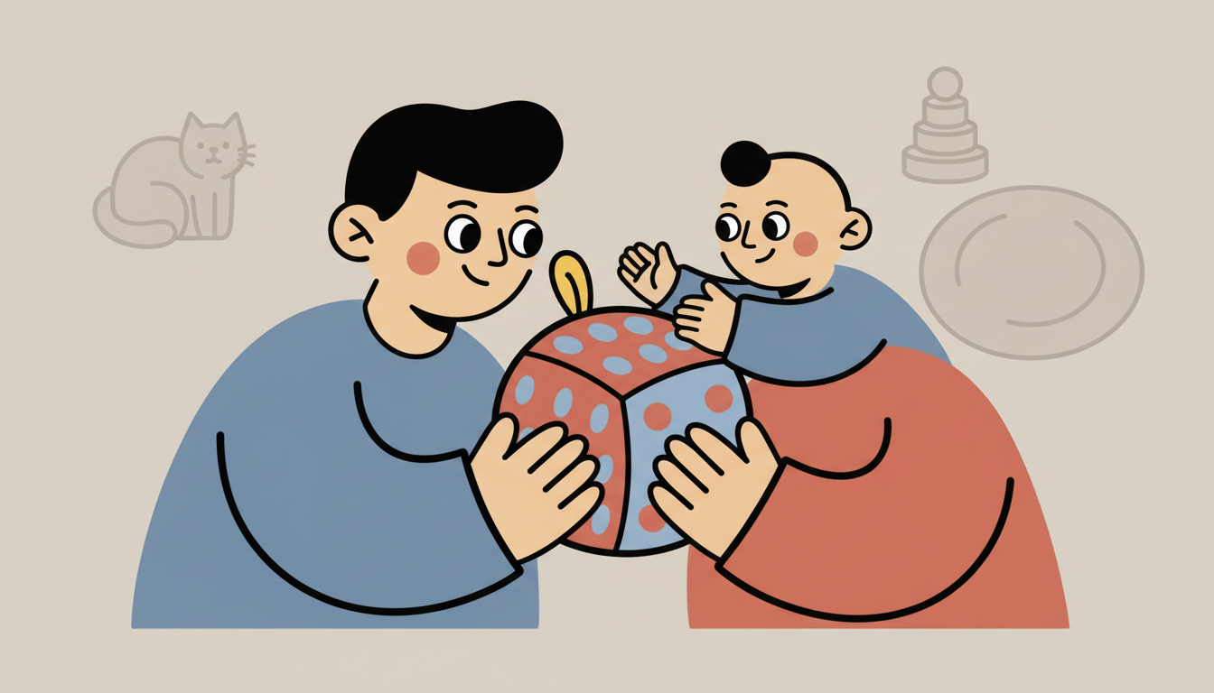 Hold a toy or safe household object between you and your child. Take turns touching it, shaking it, or exploring it in different ways. Narrate what each of you is doing with simple words. This teaches your child that objects can be shared and explored together. They learn that cooperative play is more interesting than solo play.
