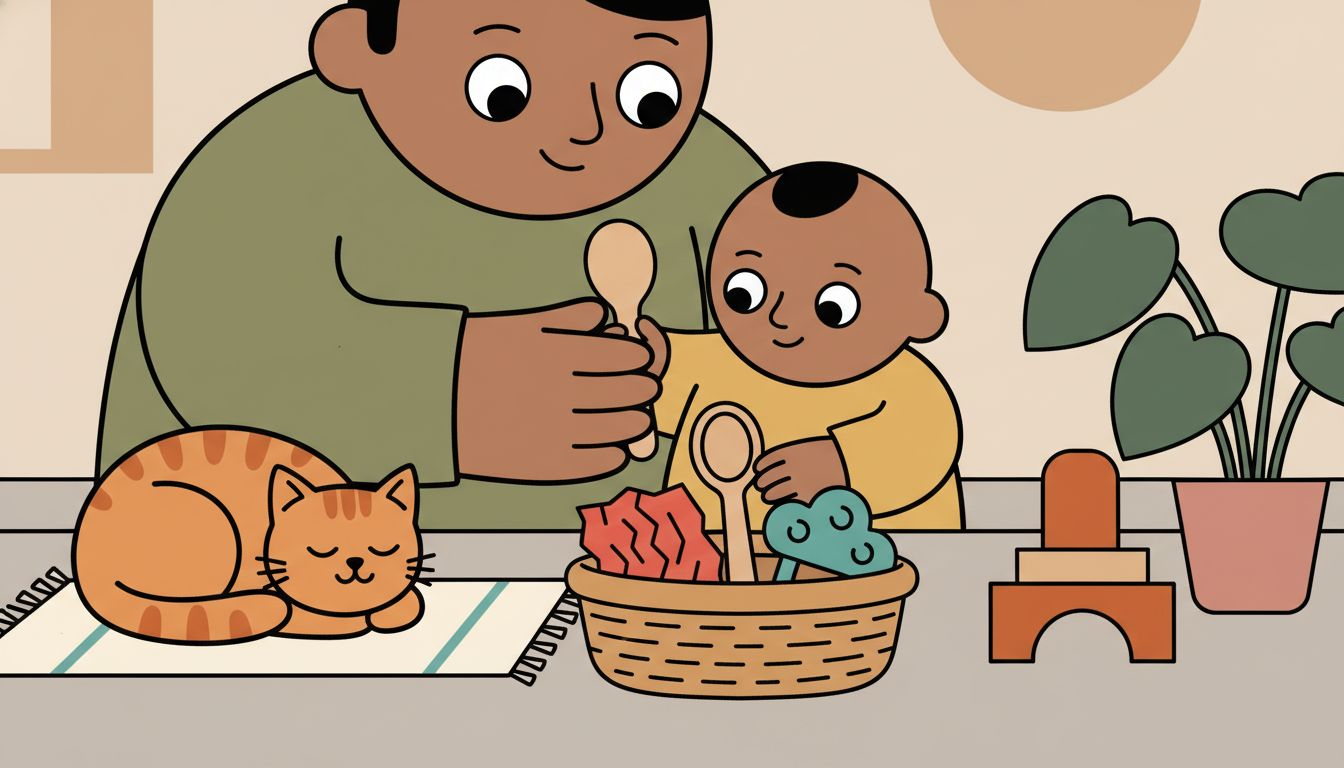 Place 3-4 safe objects with different textures in a small basket. Include items like a soft cloth, smooth wooden spoon, crinkly paper, or silicone teether. Let your child explore each item through touch and supervised mouthing. Name each texture as they explore. This sensory activity builds cognitive connections about material properties.