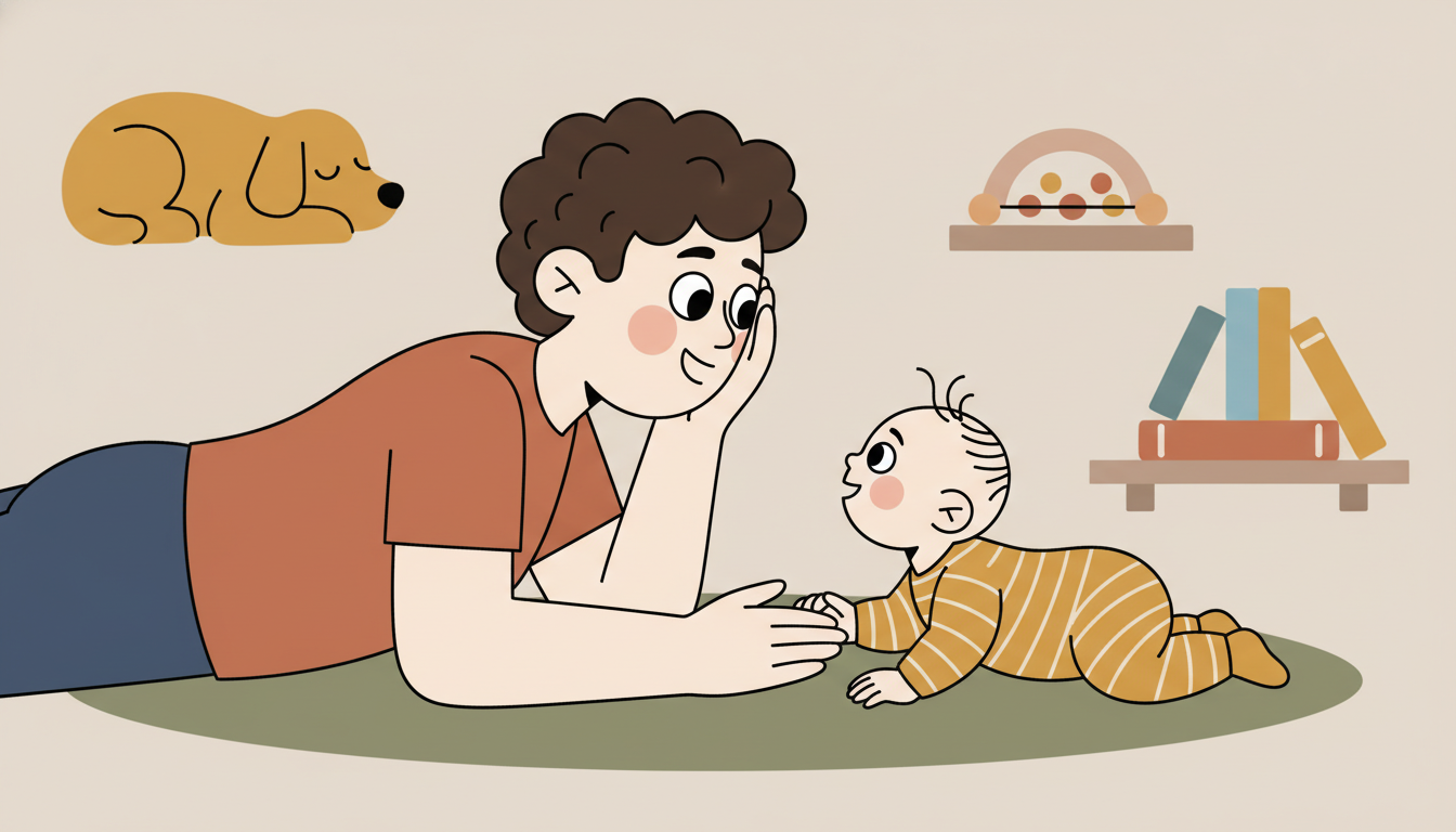 During tummy time, get down at your child's eye level and describe what they're doing and seeing. When they make sounds or move, respond with encouraging words. Narrate their efforts as they lift their head or reach for objects. This combines physical development time with rich communication practice.