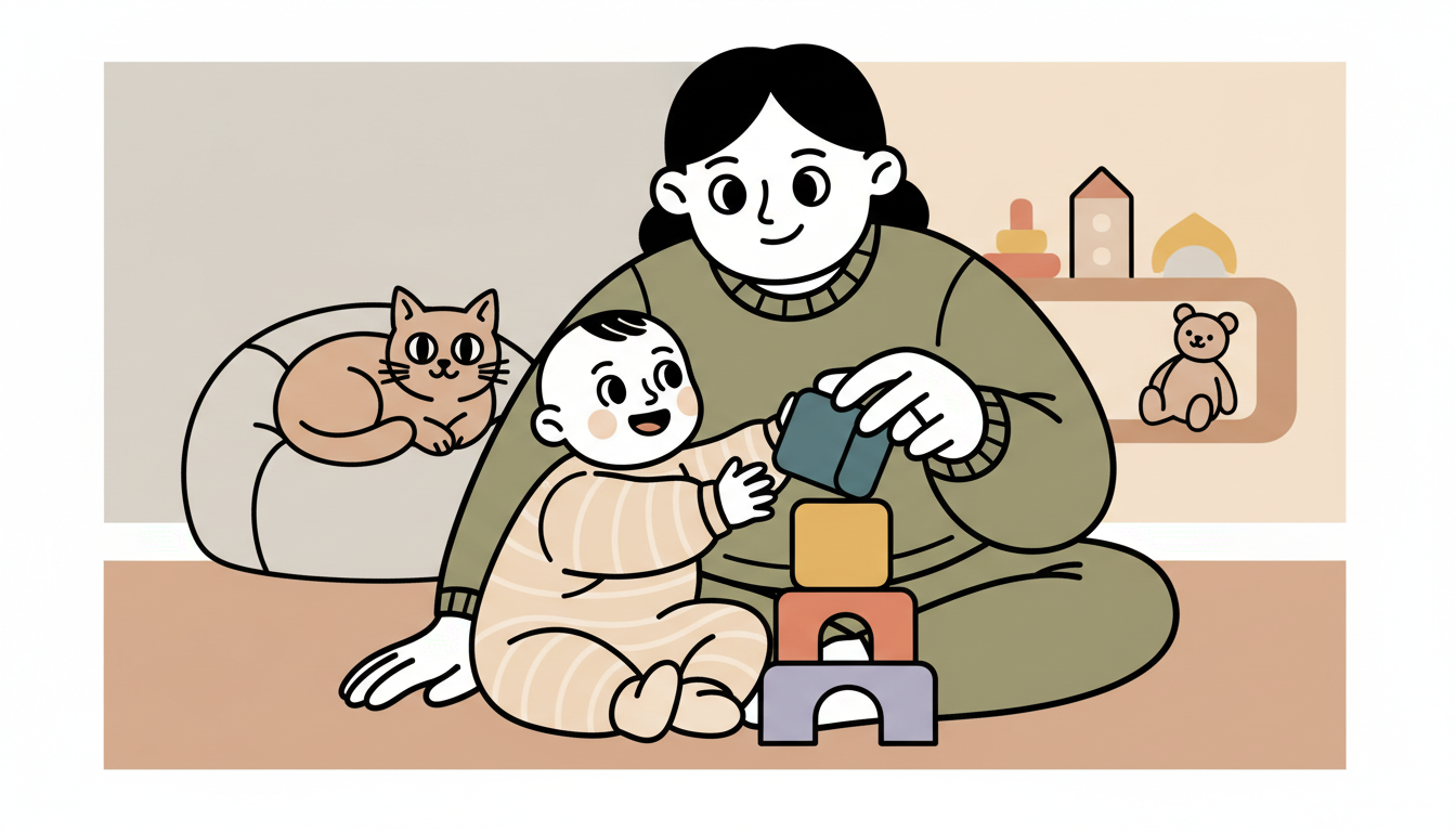 Sit with your child and a few soft blocks or stacking cups. Take turns placing one block on top of another to build a small tower. Celebrate together when the tower stands or falls. This cooperative building teaches your child that working together creates something neither could do alone. They learn to coordinate their actions with yours toward a shared goal.