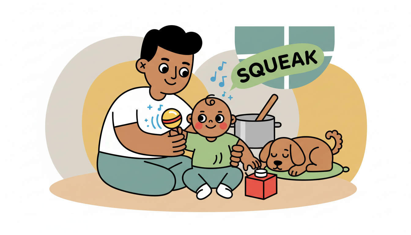 Rattles, squeaky toys, or household items like wooden spoon and pot