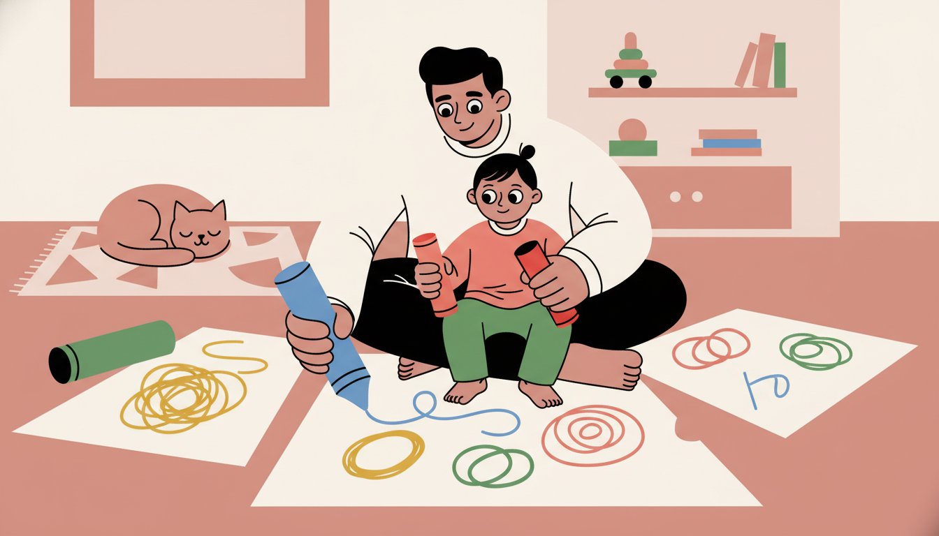 Give your child a few crayons and paper and let them scribble freely. Sit with them and draw your own simple marks. Talk about what you're both doing: 'You're making big circles' or 'I'm trying to draw a line.' Avoid praising the picture itself. Instead, notice their process: 'You're using the red crayon now' or 'You're pressing hard.' This keeps focus on exploration and effort, not creating something 'good.'