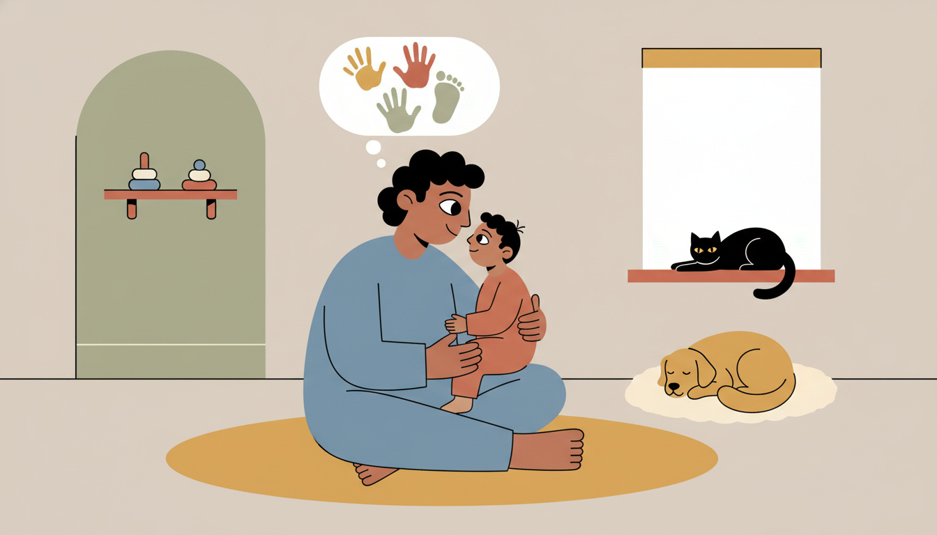Sit together in a calm moment and gently touch different parts of your child's body while naming them and the connection. Touch their hand and say "your hand, my hand" while placing your hands together. Touch their foot and say "your foot" with a gentle voice. Then let them touch your nose, hand, or hair. This can become a quiet bonding routine before nap or bedtime. The gentle physical contact combined with your warm voice creates a sense of safety and connection. You are teaching them about bodies, boundaries, and the comfort of loving touch.