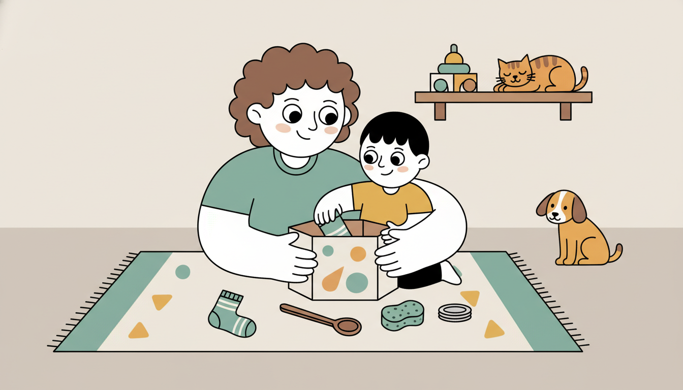 Create a simple discovery box by placing three to four safe household items in a container. Let your child reach in without looking and guess what each item is by touch alone. Use items with different textures like a soft sock, smooth spoon, bumpy sponge, or cool metal lid. After they guess, let them pull it out to see if they were right. Switch roles and let them hide items for you to guess.
