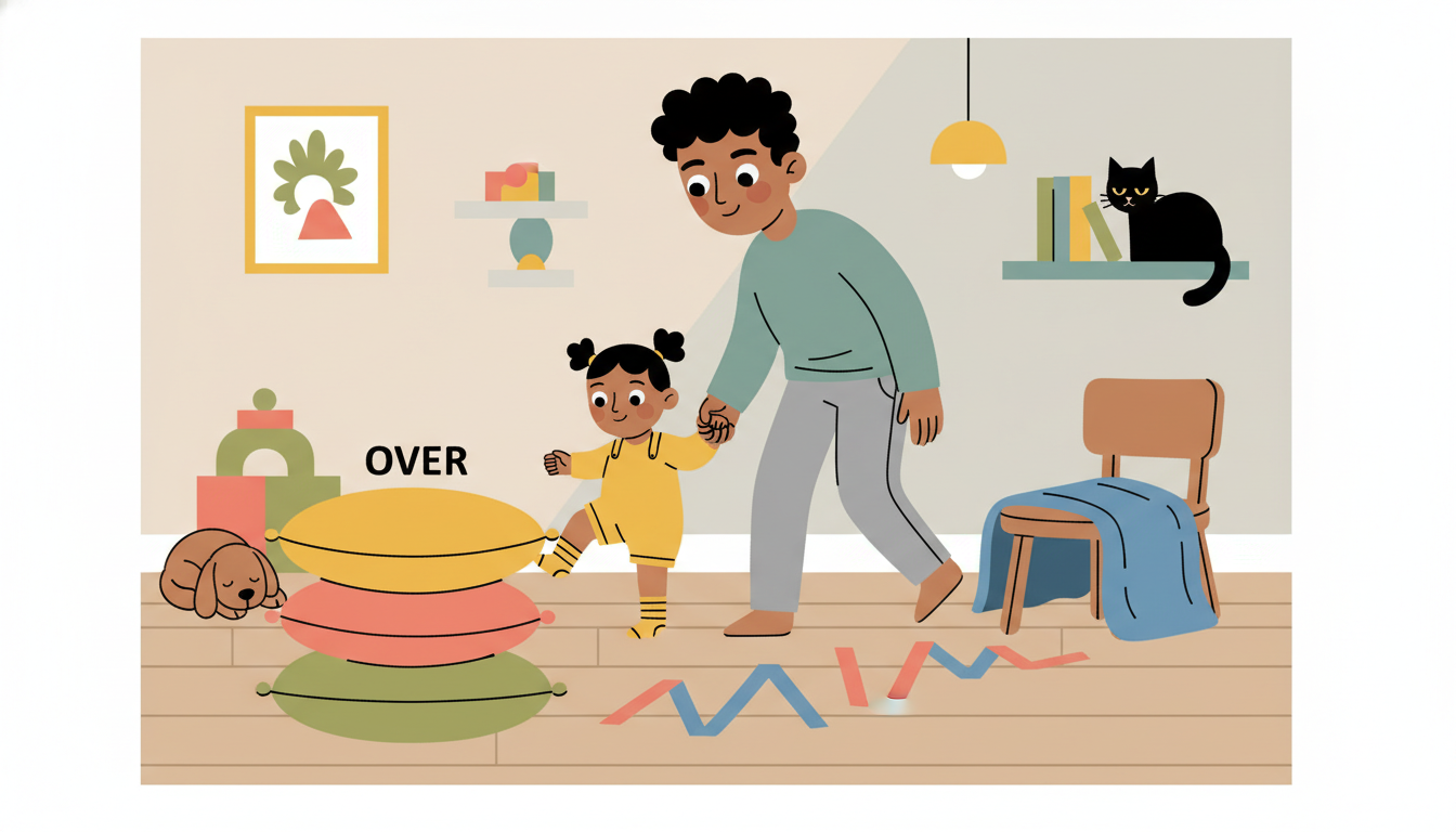Create a simple course using pillows to step over, chairs to crawl under, and tape lines to walk along. Guide your child through the course, using words like over, under, and through. This activity builds gross motor skills like climbing and balancing while supporting spatial awareness. Make it playful by pretending you're exploring a jungle or going on a treasure hunt.