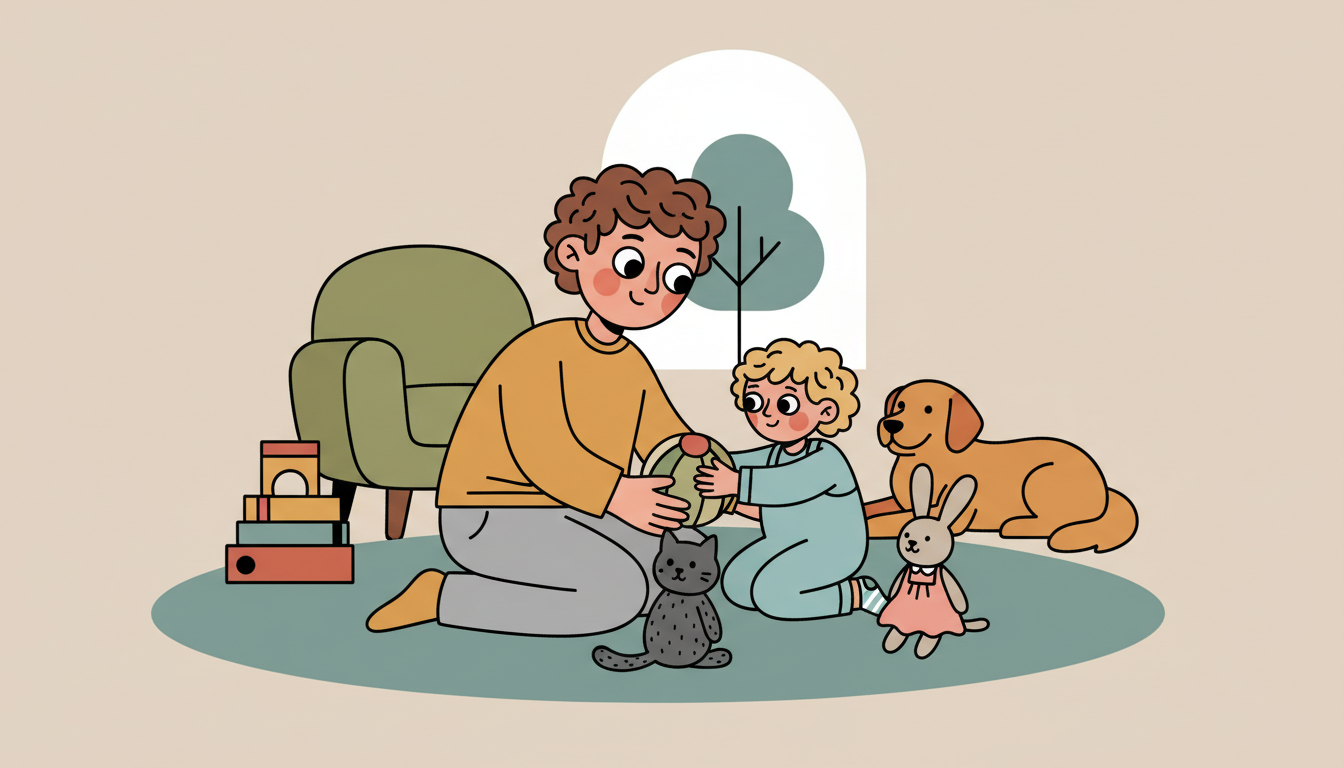 Sit in a circle with your child and any family members or stuffed animals. Roll a soft ball to your child, then have them roll it to the next person or toy. Guide them to say the person's name before rolling. This teaches them to wait, watch, and participate in group activities.