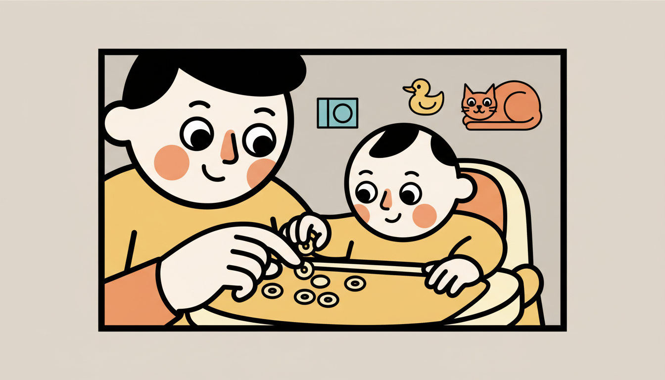 Scatter small soft objects like cereal pieces on their high chair tray. Let your child practice picking them up with their developing pincer grasp. Narrate their attempts: 'You're using your fingers to grab it' or 'You're trying again.' Don't rush to help even if it takes time. Each attempt builds their skill and confidence.
