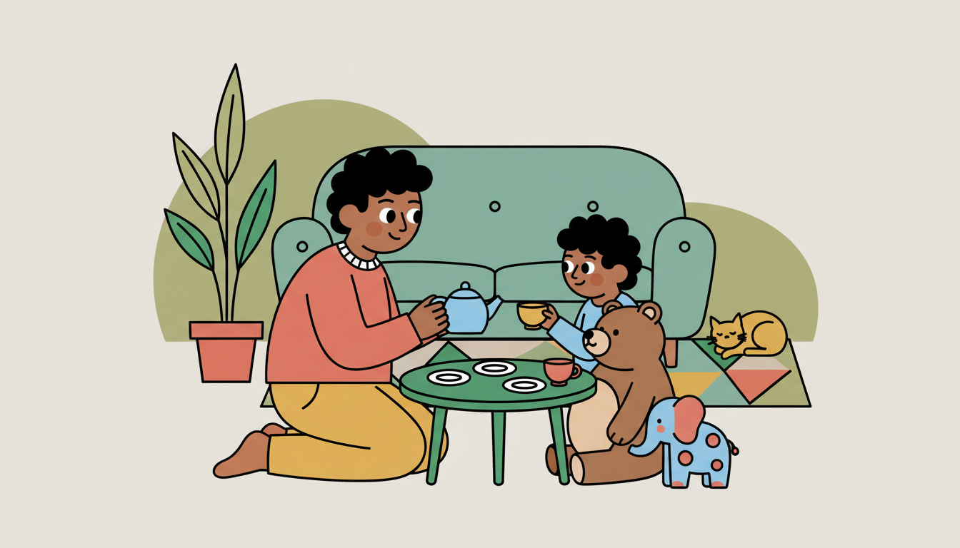 Keep it short and simple, just five to eight minutes at this age. Gently coach your child through the social scripts: 'Can you ask teddy if he wants more?' Let your child lead sometimes, even if the 'rules' of tea time get creative.