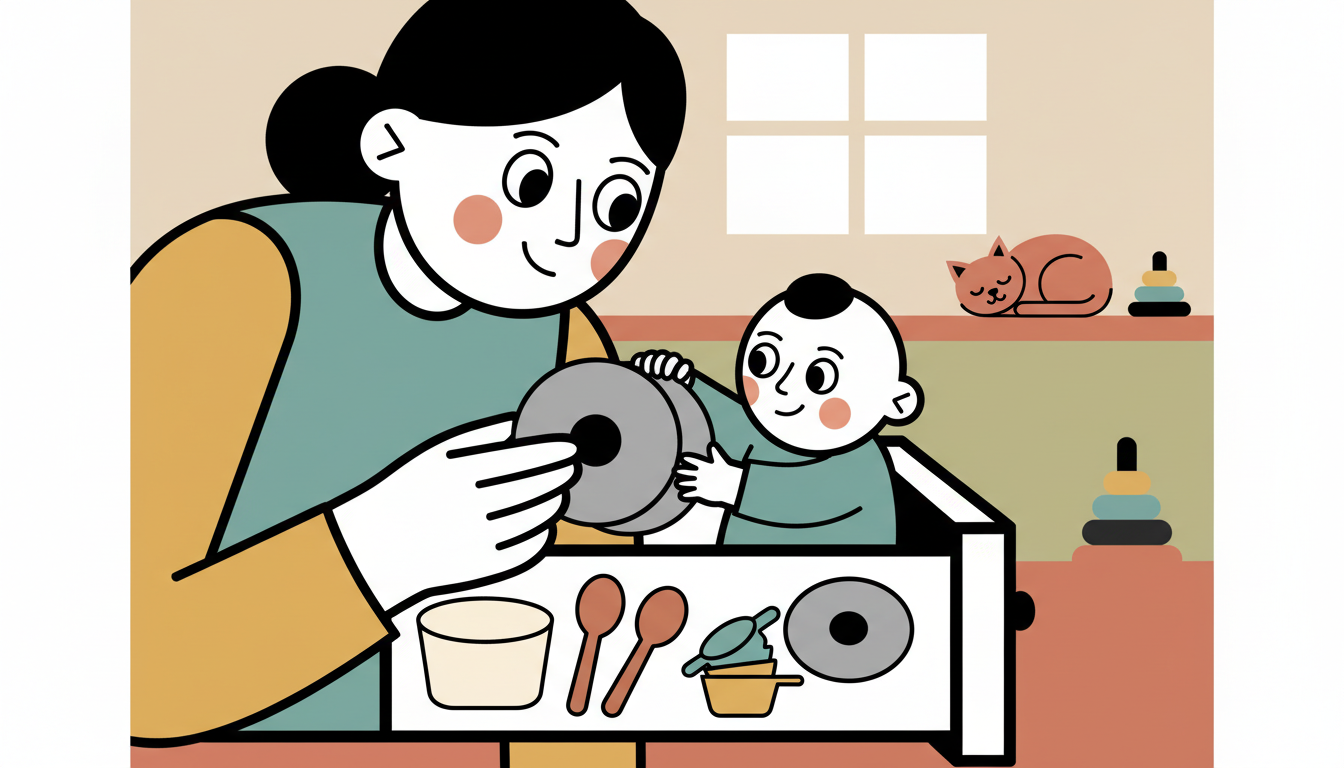 Designate one low kitchen drawer or cabinet as your child's exploration space. Fill it with safe items like plastic containers, wooden spoons, measuring cups, and pot lids. Let them open the drawer independently and discover what is inside. They can pull items out, bang them together, and explore freely. This gives them autonomy while you prepare meals nearby.