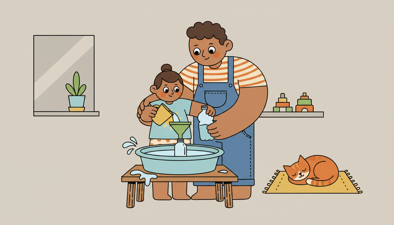 Set up a simple water play activity at the sink or in a shallow tub. Give your child cups or containers to scoop and pour water. This activity naturally involves spills, misses, and trying again to get the water where they want it. When water spills, stay calm and say, 'The water spilled. Let's try pouring more slowly.' This shows that mistakes happen and we can adjust our approach. The immediate feedback of water helps children see the results of their efforts and adjust their strategy.