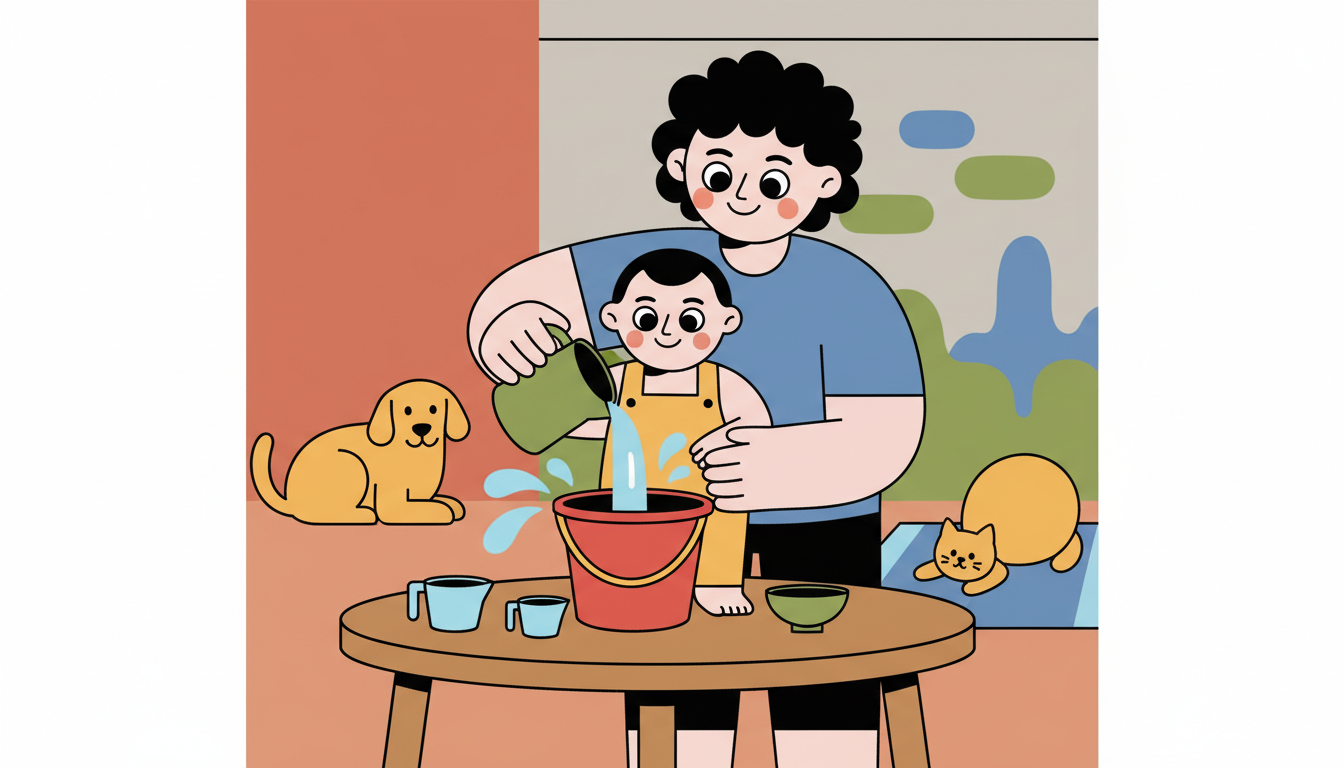 Place a towel underneath to catch spills and reduce cleanup stress. Show them once, then step back and let them experiment on their own. Talk about what's happening using simple words like full, empty, or splash.