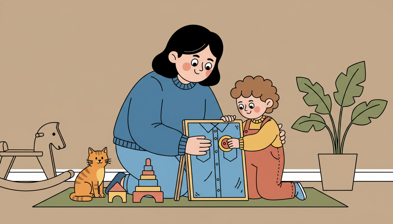 Create a simple practice board using an old shirt with large buttons or a jacket with a big zipper. Let your child explore fastening and unfastening these closures. These tasks are genuinely hard for small hands but achievable with practice. When your child struggles, acknowledge it by saying, 'Buttons are tricky. Your fingers are working hard.' Then you might help them position the button but let them push it through. This balance of support and challenge builds both skill and resilience through repeated practice.