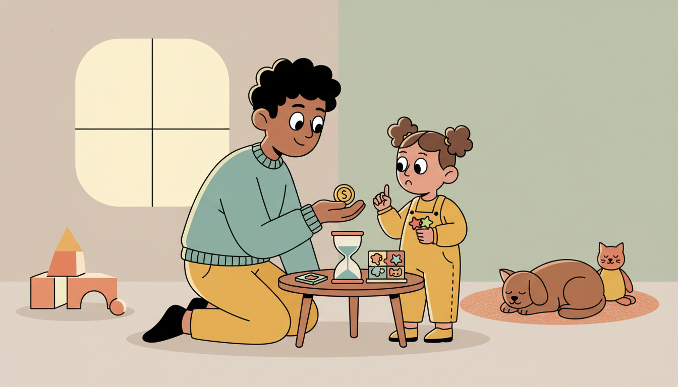 Give your child one token or coin. Explain they can trade it now for one small sticker, or wait until the end of playtime (about 10 minutes) to trade it for two stickers. Make the wait time visible with a timer or by saying 'after we finish this puzzle.' Let your child make the choice and experience the outcome either way.