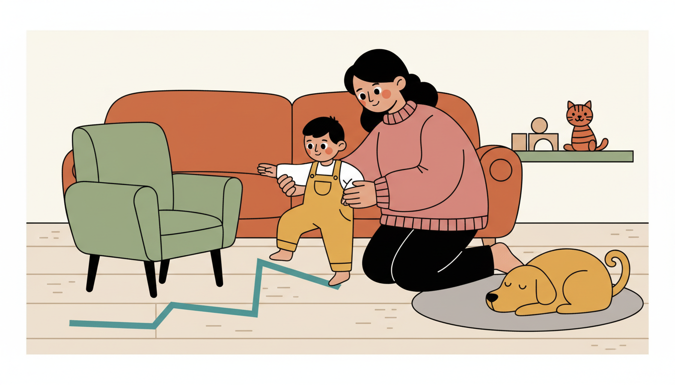 Use your couch, sturdy chairs, or outdoor playground equipment to practice climbing up and down with your supervision. Add simple balance challenges like walking along a low curb or a line of tape on the floor. Stay close for safety while encouraging independent movement.