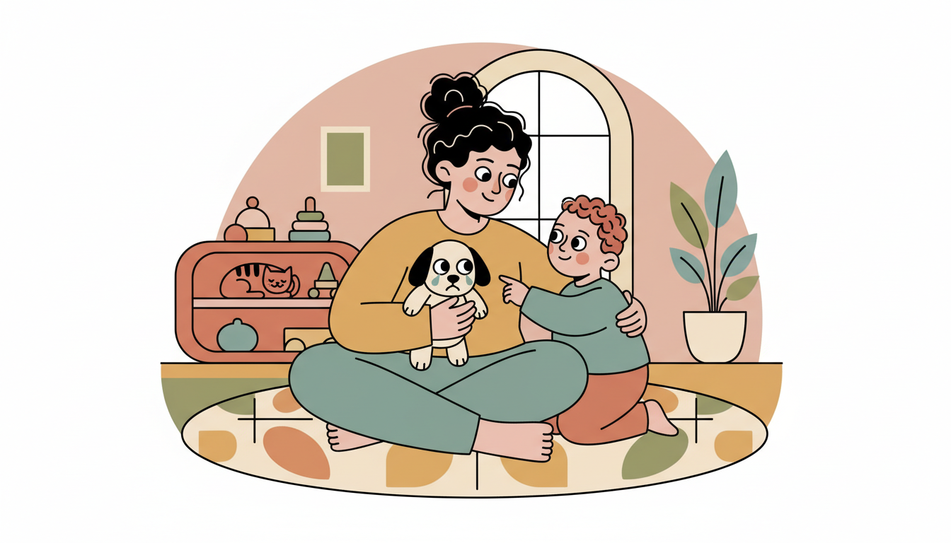 During play, pretend one of your child's toys is sad or hurt. Say 'Oh no, doggy fell down. Doggy is sad and crying.' See what your child does. If needed, model comforting: 'I will give doggy a hug. There, there, you will be okay.' Invite your child to help comfort the toy too.