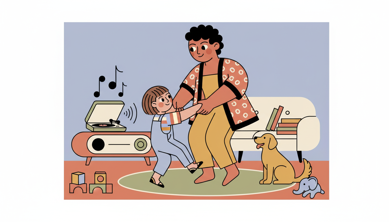 Put on music you both enjoy and dance together in your living room. Try different movements like jumping, spinning, or marching. Let your child choose songs and dance moves. Copy each other's movements and laugh together. Make silly faces and celebrate the fun.