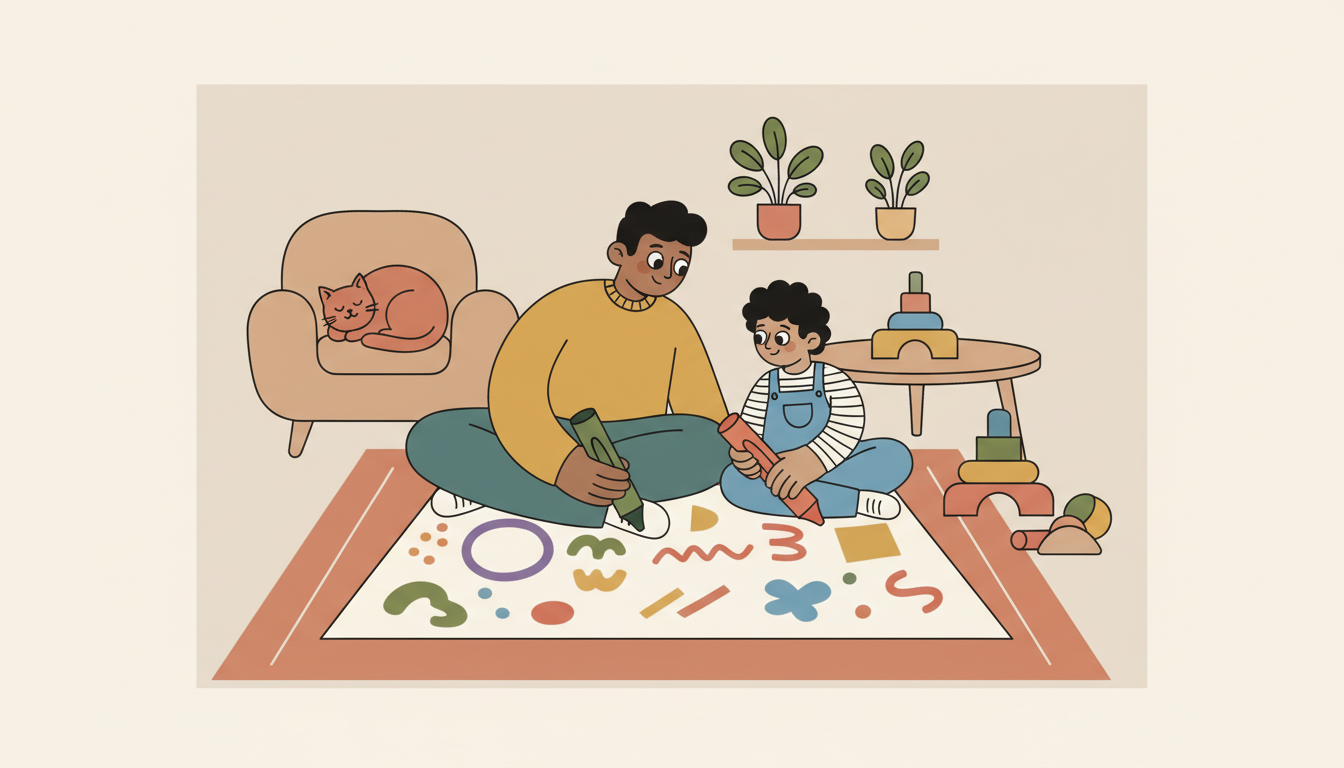 Sit down with one large piece of paper and crayons. Take turns adding marks or scribbles to create a shared picture. You might draw a circle, then your child adds lines, then you add more shapes.