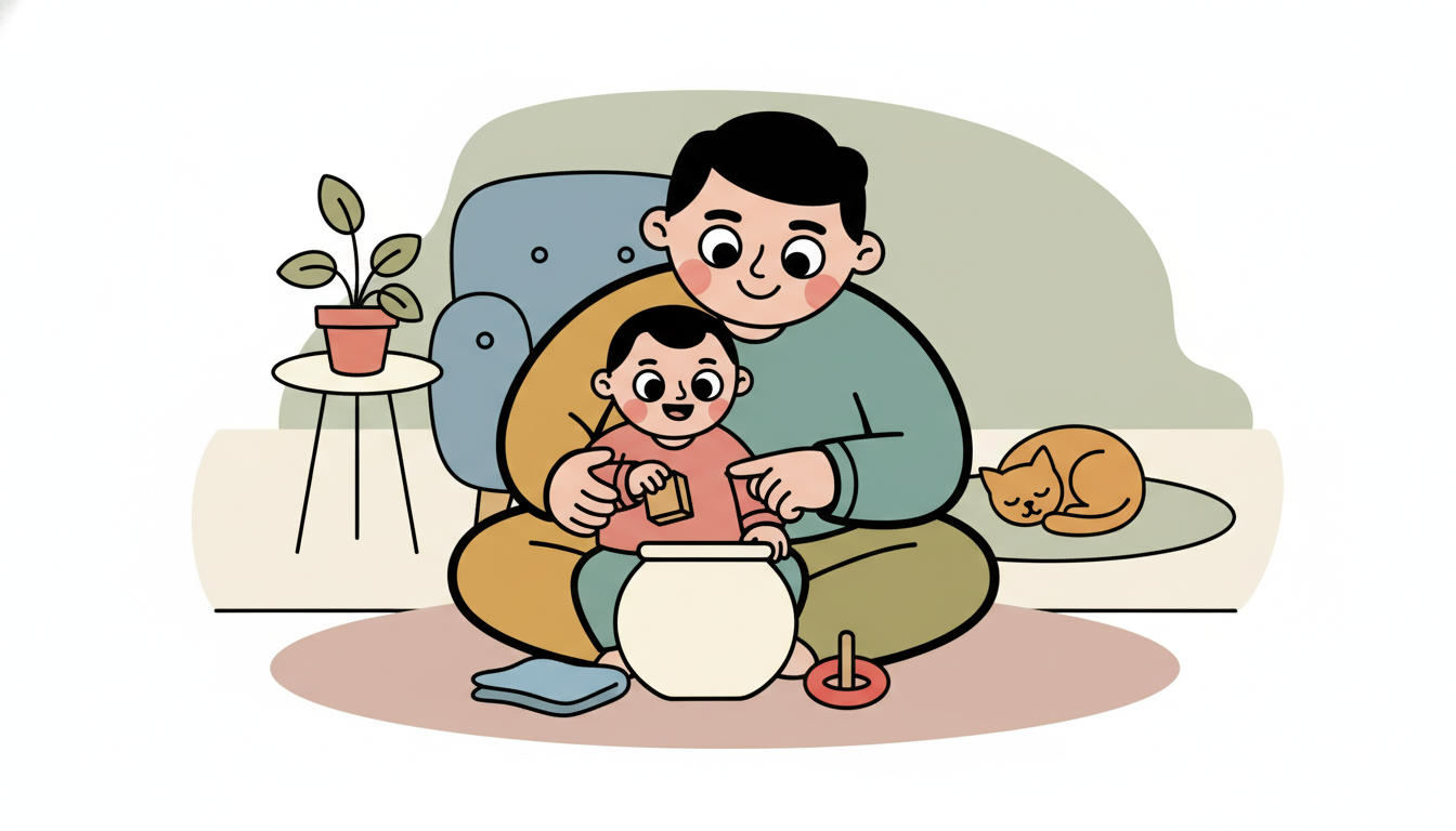 Give your child safe objects of different materials to drop into a container. Try a wooden block, a soft cloth, and a plastic toy. Let them discover that different items make different sounds when they drop. This builds cause-and-effect understanding.