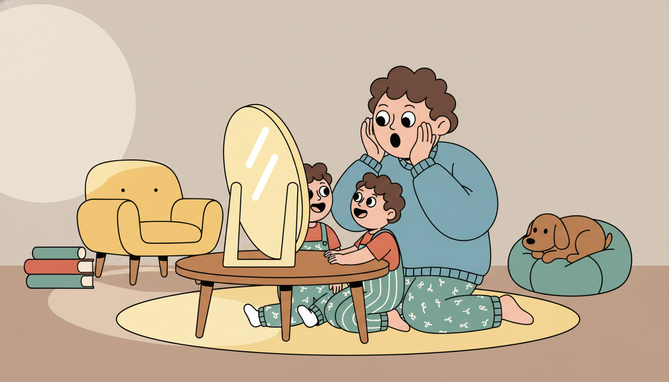 Sit with your child and take turns making different emotion faces in a mirror together. Name each emotion as you make the face. Try happy, sad, angry, surprised, and worried. Ask your child to copy your expressions and then let them lead. This helps build emotional recognition skills while having fun together.