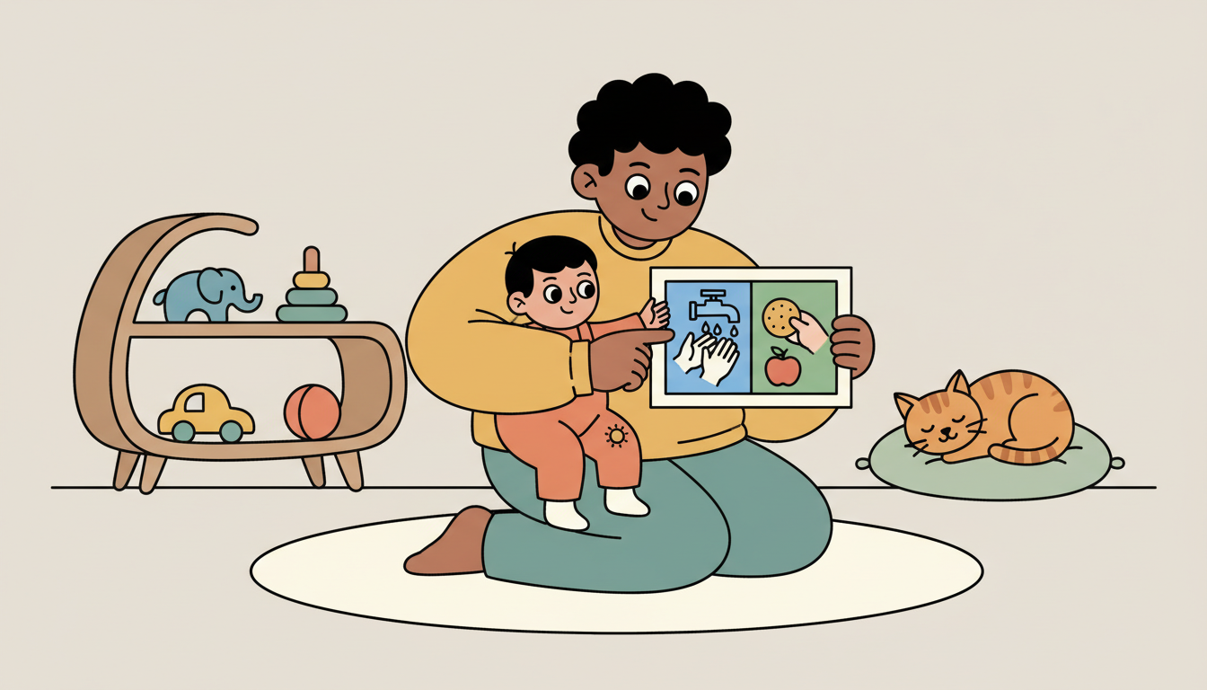 Create a simple two-picture board showing 'first' and 'then' activities. Point to the pictures and say 'first we wash hands, then we eat snack.' This helps your child understand waiting by making the sequence visible and predictable. The visual support makes abstract waiting more concrete.