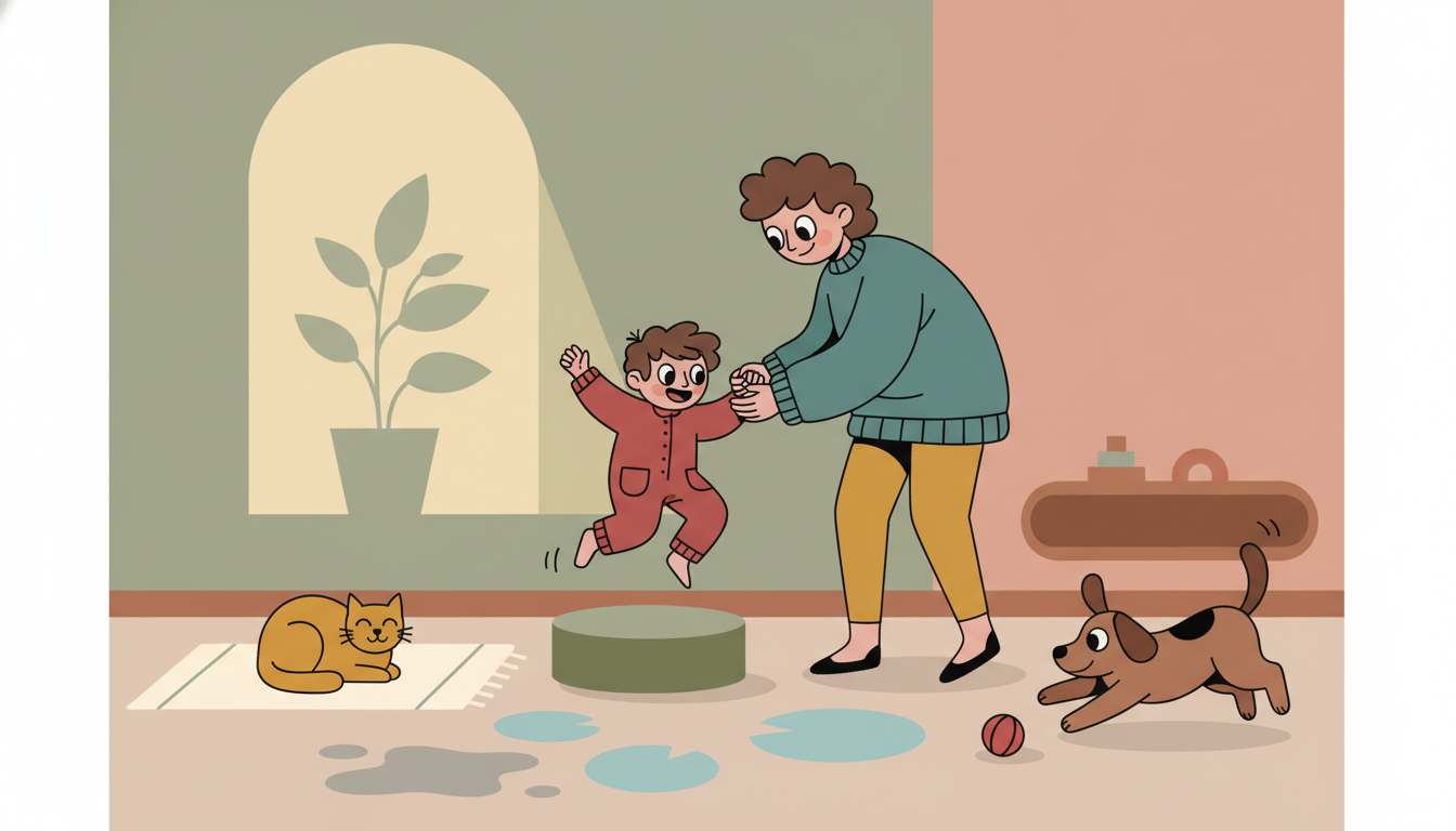 Practice different ways of jumping together in a safe space. Try jumping with both feet, hopping on one foot, or jumping from a small step. Focus on landing softly and safely. Make it playful by pretending to jump over puddles or onto lily pads. This builds important physical skills while giving your child a fun way to use their energy. A few minutes of jumping can shift mood and energy in positive ways.