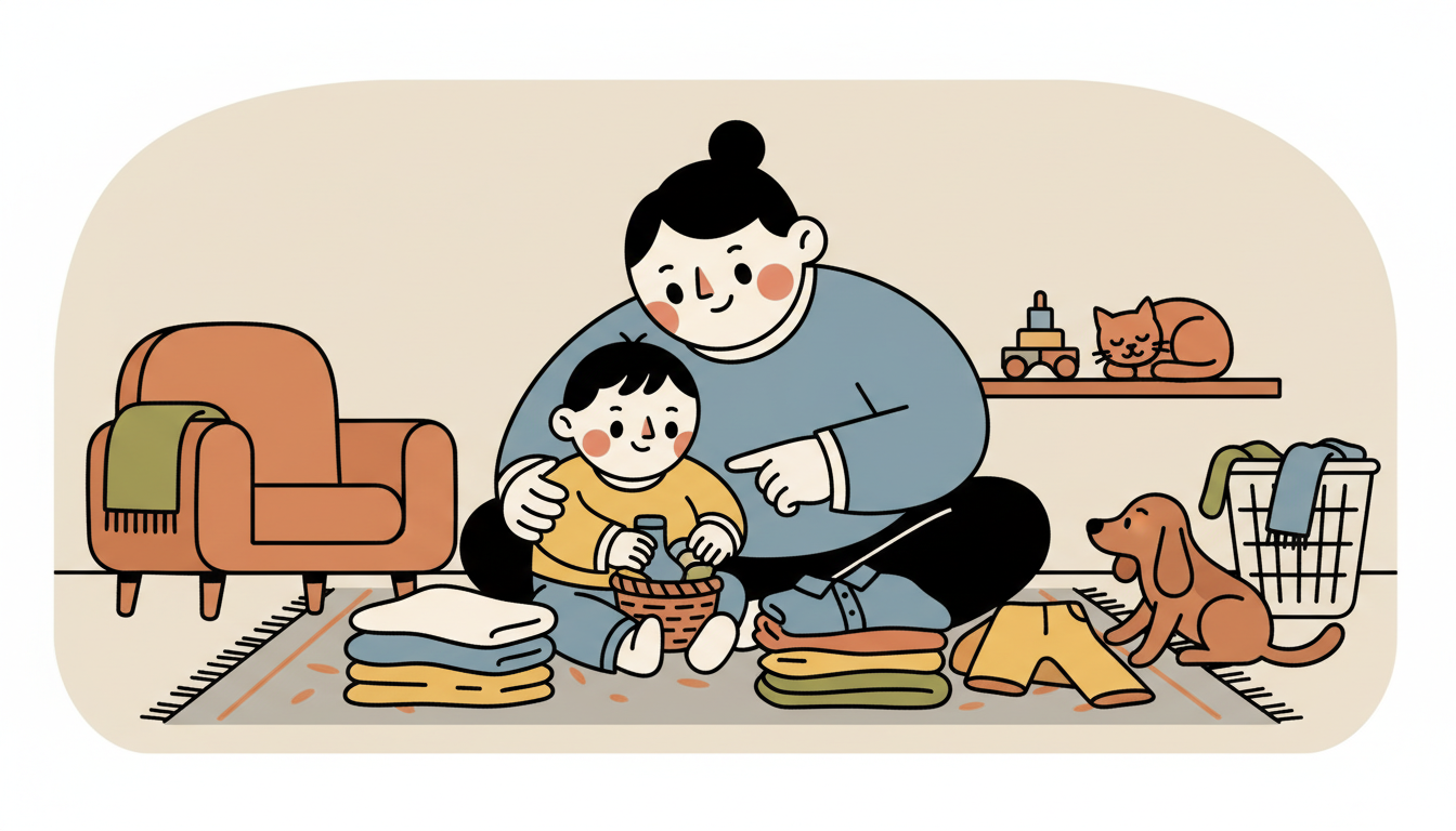 During laundry time, ask your child to sort clean clothes into simple categories like shirts in one pile and pants in another. You can also have them match socks or sort by color. Give them their own small basket to work with. This activity builds categorization skills while creating a sense that they are helping with real family work.