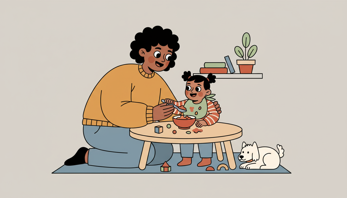 Make meal times warm and connective. Sit close to your child, make frequent eye contact, and use a gentle, pleasant tone. Comment warmly on what they are doing, respond to their gestures, and show patience with mess and exploration. Let them feel your calm, loving presence even during the chaos of toddler eating.
