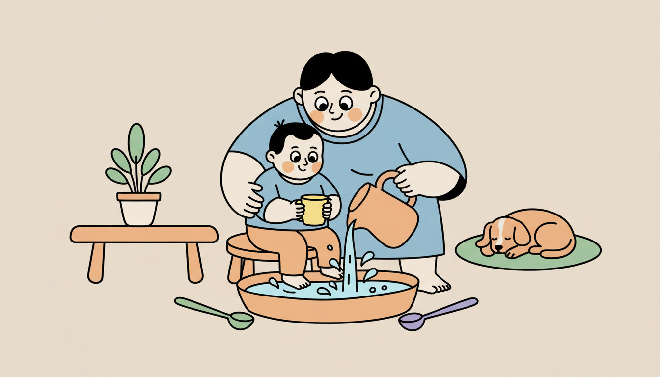 Fill a shallow container with water and give your child cups and spoons to play with. Sit with them and pour water, fill containers, and splash gently together. Talk about what you're doing and enjoy the sensory experience together. This simple activity becomes special when you're fully present with them.