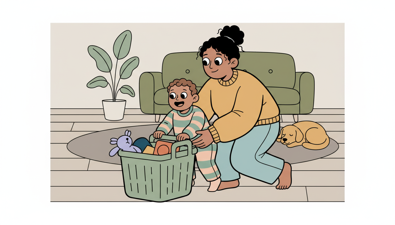 Let your child push a sturdy laundry basket or pull a light box across the floor. They can put toys in and take them out while moving the container around. This builds arm strength, coordination, and spatial awareness. The purposeful movement makes physical activity feel meaningful rather than forced.
