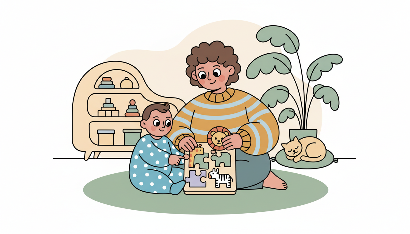 Offer a simple two to four piece puzzle that's slightly challenging for your child's current skill level. Sit nearby and let them explore. When they struggle, comment on what they're doing: 'You're trying to fit that piece' or 'You turned it around.' If they get frustrated, you can try one piece yourself, narrating your own trial and error: 'This one doesn't fit. Let me try another.' This normalizes the learning process.