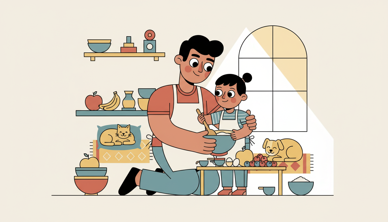 Choose recipes with simple steps your child can safely help with, like stirring or pouring pre-measured ingredients. Narrate the teamwork: 'You found the bowl and I got the spoon. We're working well together.' If mistakes happen, model problem-solving together rather than taking over.