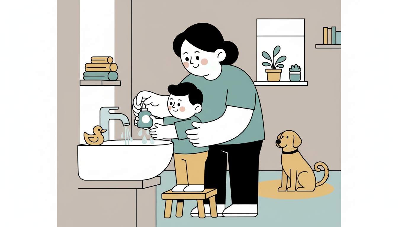 During hand-washing time, let your child do as much as possible by themselves. Use a step stool so they can reach the sink. Let them turn on the water, pump soap, rub hands together, and rinse. You can help with what they cannot reach, but let them lead the process.