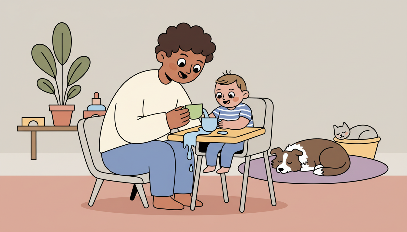 Set up for mess. Use a tray or do this activity during bath time so spills don't matter. Stay relaxed when water spills. Your calm reaction teaches them mistakes are okay. Describe what happens without judgment: 'The water went on the tray' instead of 'Oops, you spilled.'