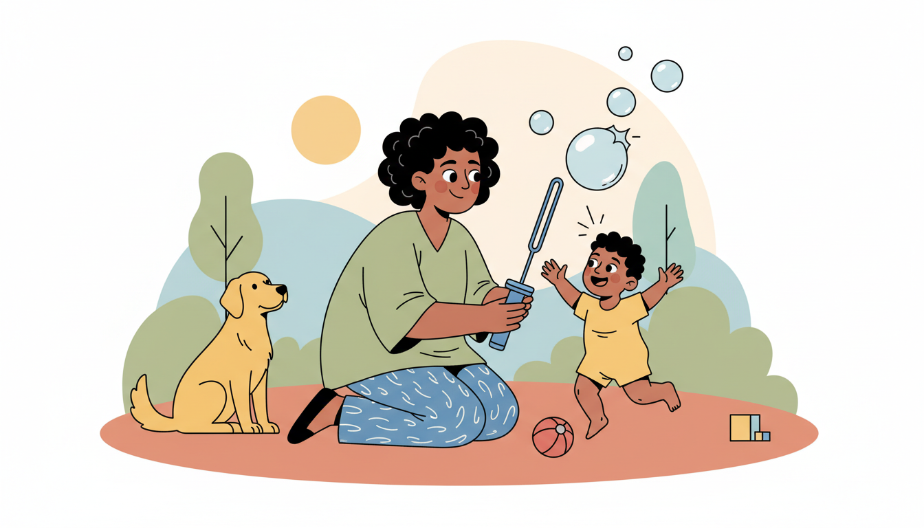 Blow bubbles at different heights to encourage reaching up and bending down. If outdoors, supervise closely and set clear boundaries.