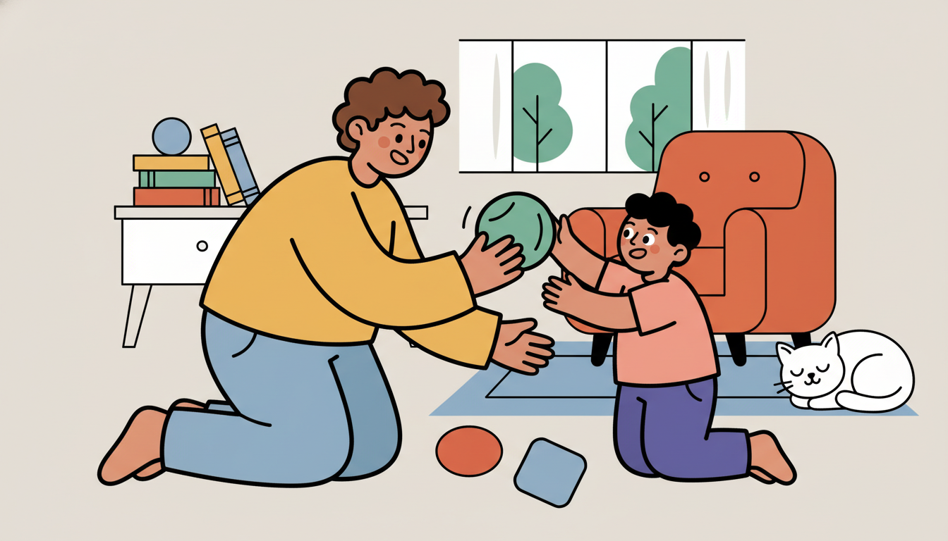 Practice throwing and catching a soft ball or bean bag together. Count successful catches and set new goals each time you play. Start close together and gradually increase distance as skills improve. Try different types of throws like underhand, overhand, or bounce passes. This builds hand-eye coordination, counting skills, and upper body strength essential for many sports and activities.