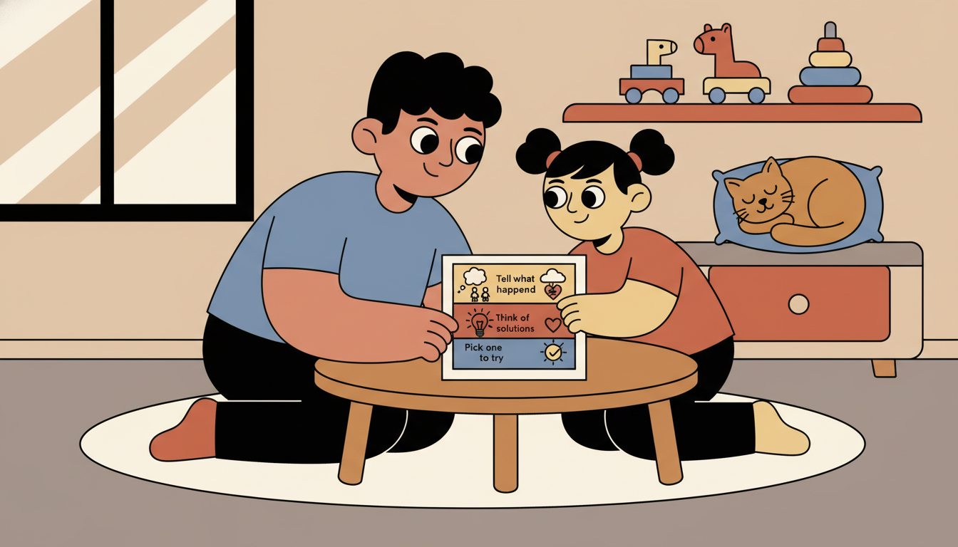 Create a simple visual chart with your child showing steps to solve problems together. Include three to four steps like tell what happened, say how you feel, think of solutions, and pick one to try. Use simple pictures or symbols your child helps choose. Reference this chart when real conflicts happen, walking through each step together until the process becomes familiar.