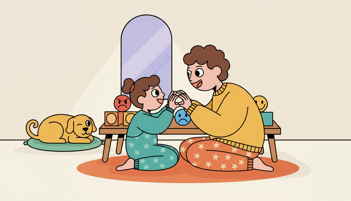 Create a simple routine where you and your child share how you're feeling. You might use feeling words, facial expressions, or even colors to describe emotions. Ask your child to show you their feeling face, then mirror it back with warmth. Share your own feelings too, keeping it simple and age-appropriate.