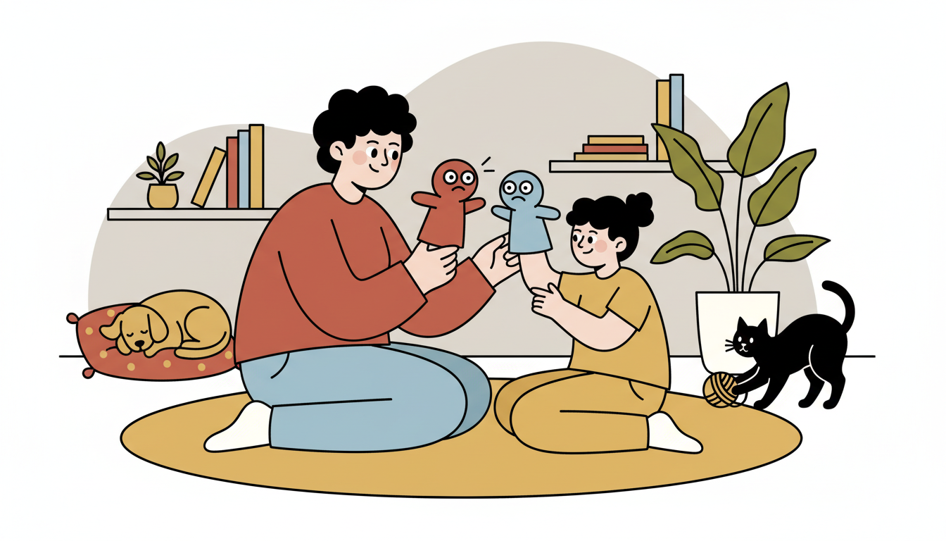 Use stuffed animals or simple puppets to act out common conflicts your child faces, like sharing toys or waiting for a turn. Make the puppet characters experience a disagreement, then guide your child to help the puppets solve it. Let your child suggest solutions and act them out. This gives safe practice for real situations without the emotional intensity of actual conflicts.