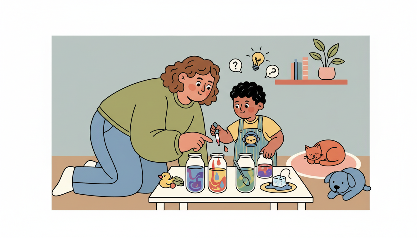 Set up a simple science experiment like mixing colors with water and food coloring, testing which objects sink or float, or observing ice melting. Before starting, ask your child to predict what will happen. During the activity, encourage observation and asking questions. Afterward, discuss what happened and why.
