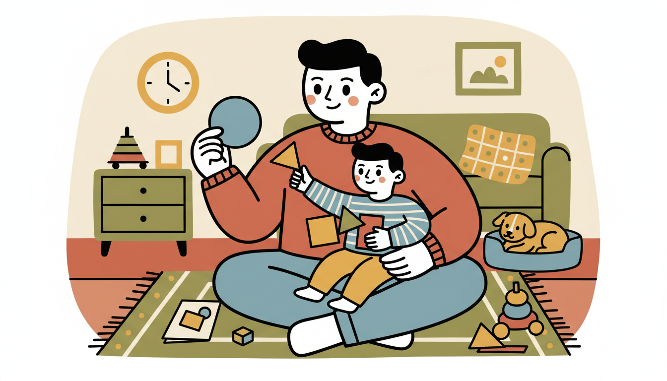 Cut out simple shapes from paper or use items from around your home that are different shapes. Show your child a circle and ask them to find other circles. Then try squares, triangles, or rectangles. Talk about what makes each shape special, like 'This one is round' or 'This one has corners.' You can make it a scavenger hunt by walking around together finding shapes in your home.