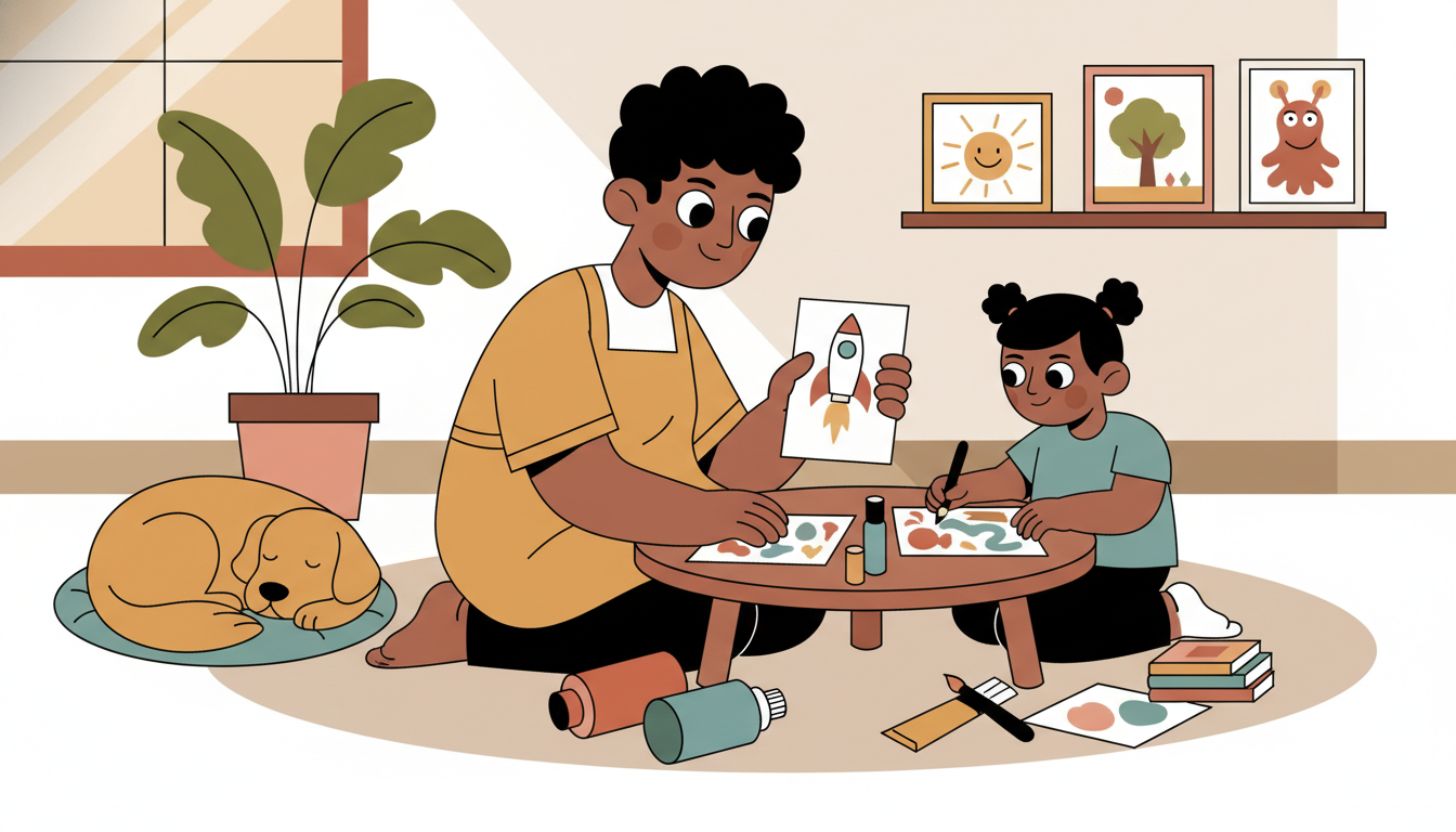 Working on parallel creative projects provides natural opportunities for conversation and connection while respecting individual expression. Children who regularly participate in family activities show 25% better emotional regulation and social skills, as shared activities provide scaffolding for communication and relationship building (Roehlkepartain & Leffert, 2000). The activity also supports fine motor skills like drawing and cutting.