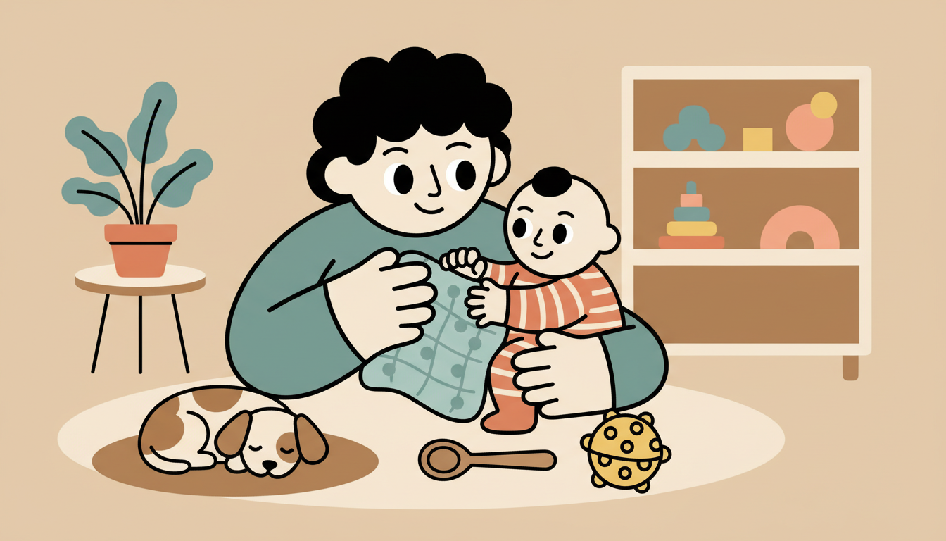 0–6 monthsEmotional WellbeingMaterials: Three to four household items with different textures (soft cloth, smooth wooden object, textured rubber toy, bumpy fabric)