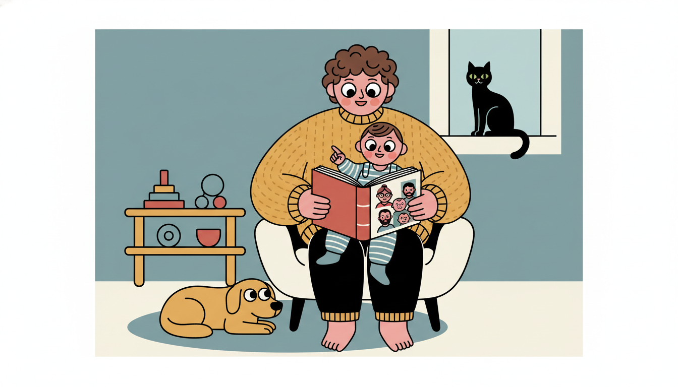 Look at family photos together, either in a photo album or on your phone. Point to each person and say their name. Say simple things like "that is grandma" or "there is you." Show photos of family gatherings or everyday moments. Your child may point at pictures or try to say names. Respond with warmth to any attempt at communication. You can also show photos of your child with family members, reinforcing their connections. This activity helps your child understand they are part of a larger network of caring people.