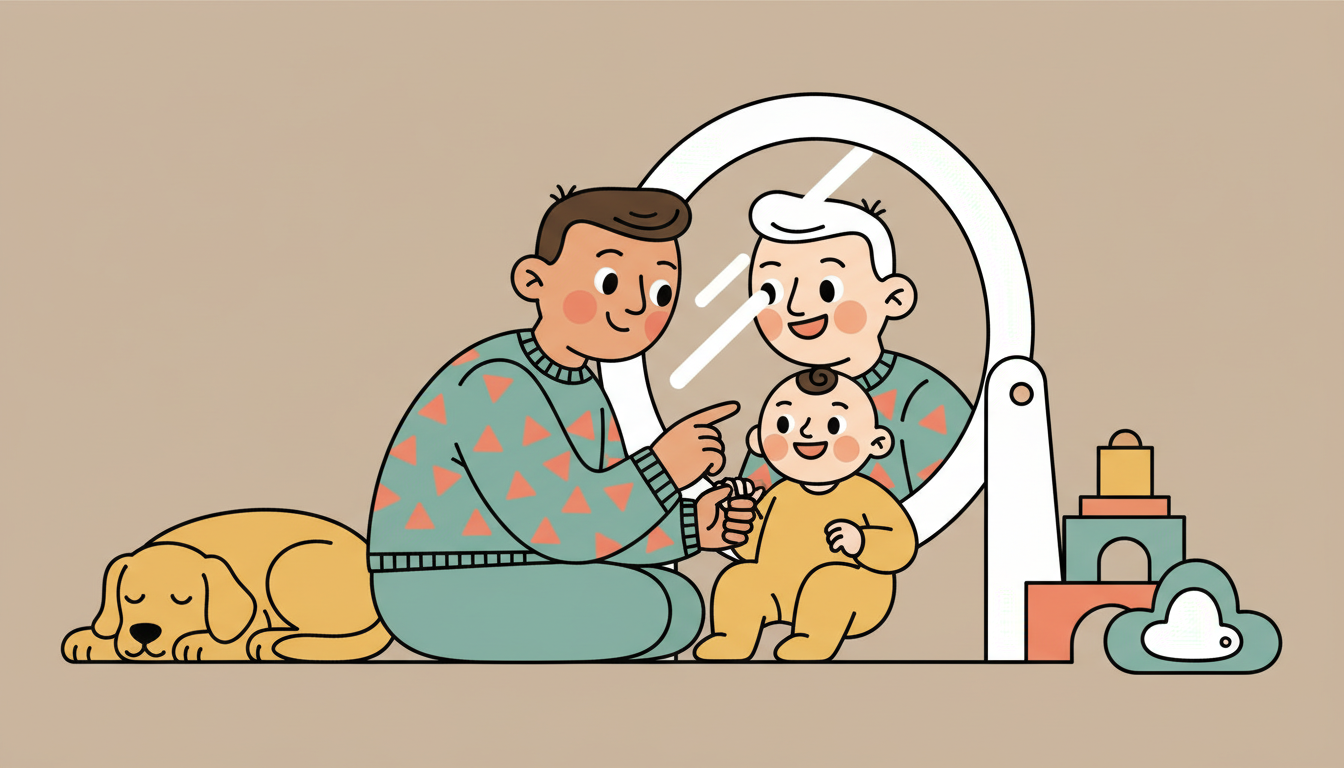 Sit with your child in front of a mirror during play. Smile at your reflections and use warm expressions. Point to your child's reflection and say "I see you" with delight. Make gentle faces and watch your child begin to imitate your positive expressions.